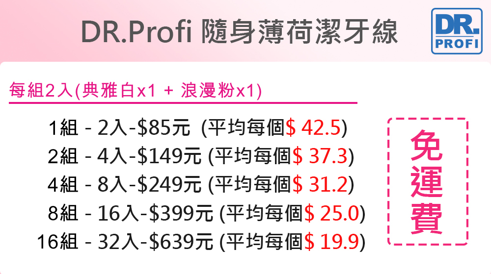 | Dr.Profi-日本熱銷隨身薄荷潔牙線-牙齒漂亮超潔白!隨身攜帶薄荷潔牙線,飯後刷牙搭配牙線清潔,完整清除齒縫細節,維持一口美牙,笑容更迷人平均每組最低只要40元起(含運)即可享有【Dr.Profi 售價:40 我要購買 |